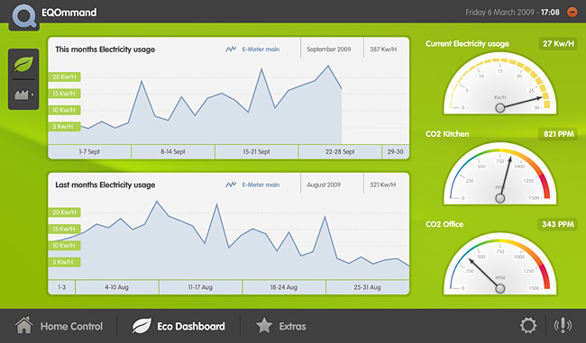 De EQOmmand software is sinds kort ook uitgebreid met de Eco Dashbord applicatie. Hiermee kunt u eenvoudig alle uitgangen in een grafiek worden vergeleken en bekeken worden. U kunt hiermee ook de elektriciteits- gas-, en watermeters visualiseren. Zo kunt u eenvoudig zien hoeveel u gebruikt en deze gegevens vergelijken met dezelfde periode voorgaande jaren.